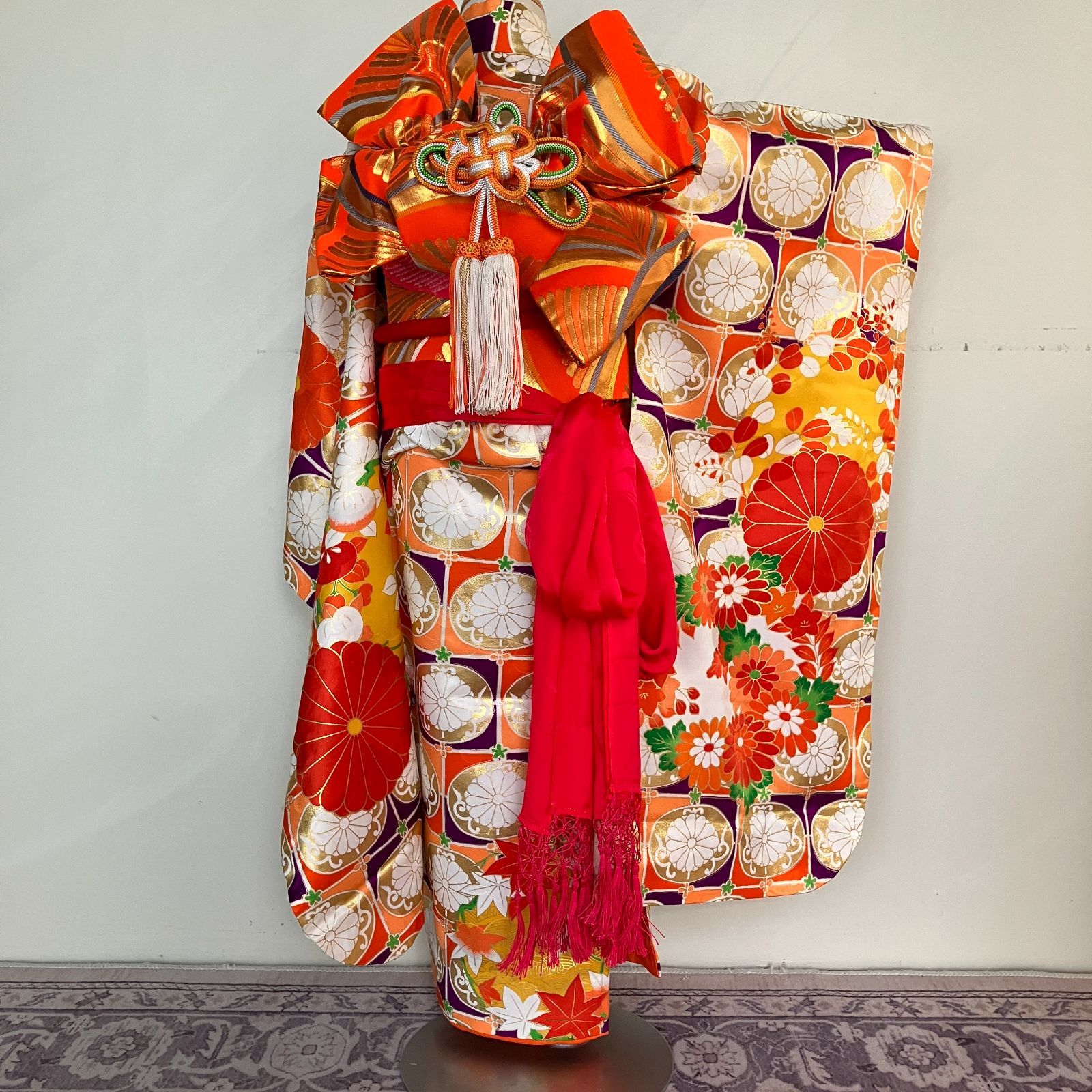 七五三 7歳女の子 着物 四つ身 紫×オレンジ 半襦袢 作り帯セット 帯揚げ帯締めしごき付き ビンテージ きもの猫田 T 332332