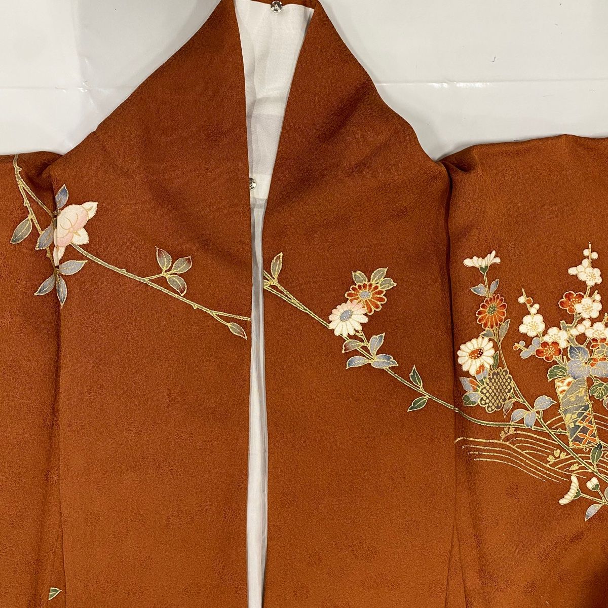 訪問着 身丈164.5 cm 裄丈63.5 S 袷 文箱 草花 金彩 染め分け 赤茶 正絹 秀品 一つ紋
