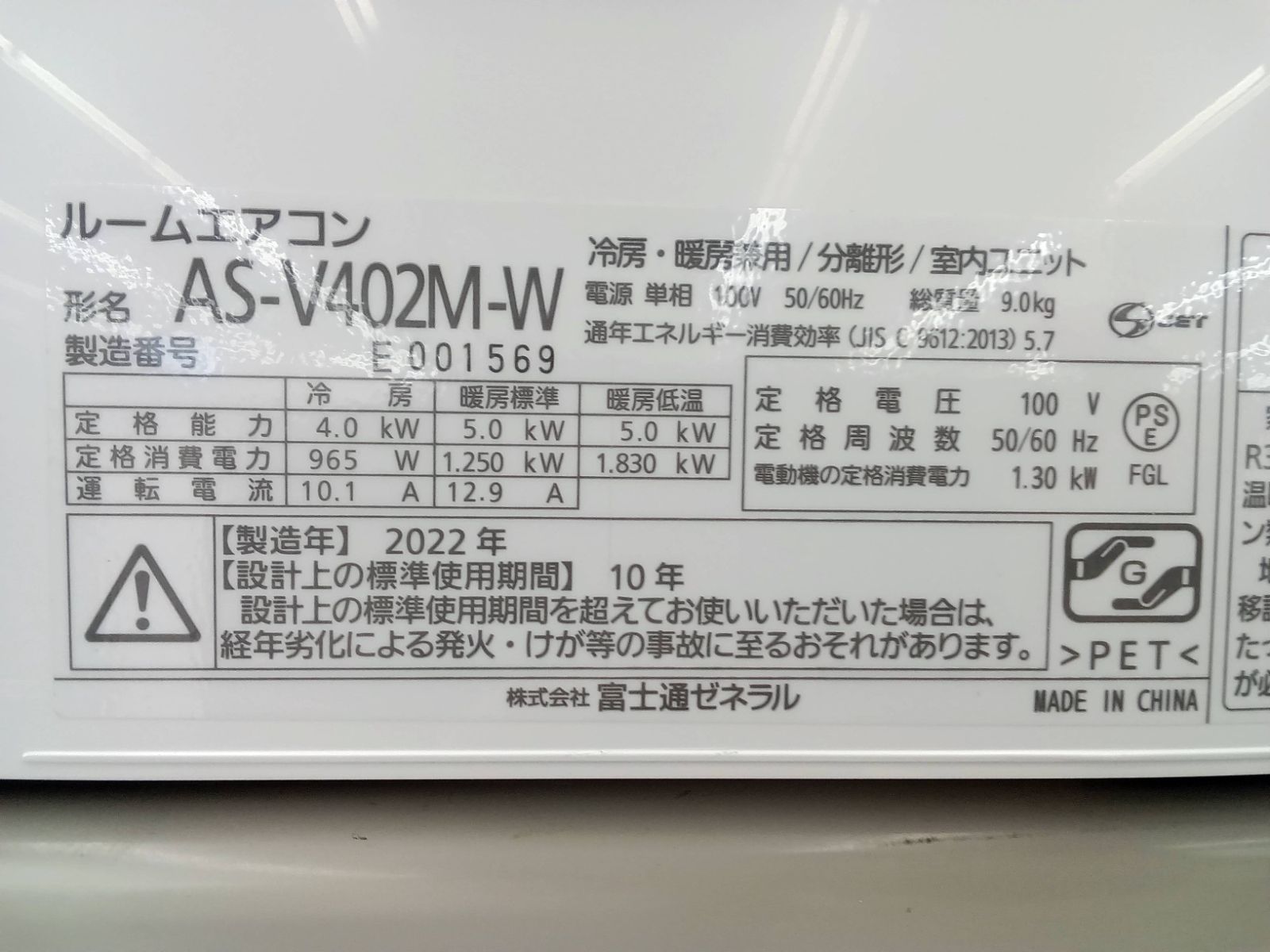 関東地域 販売 FUJITSU ルームエアコン 2025年製 4.0 kw AS-V 402 M-W 室内機と室外機のセット H 24