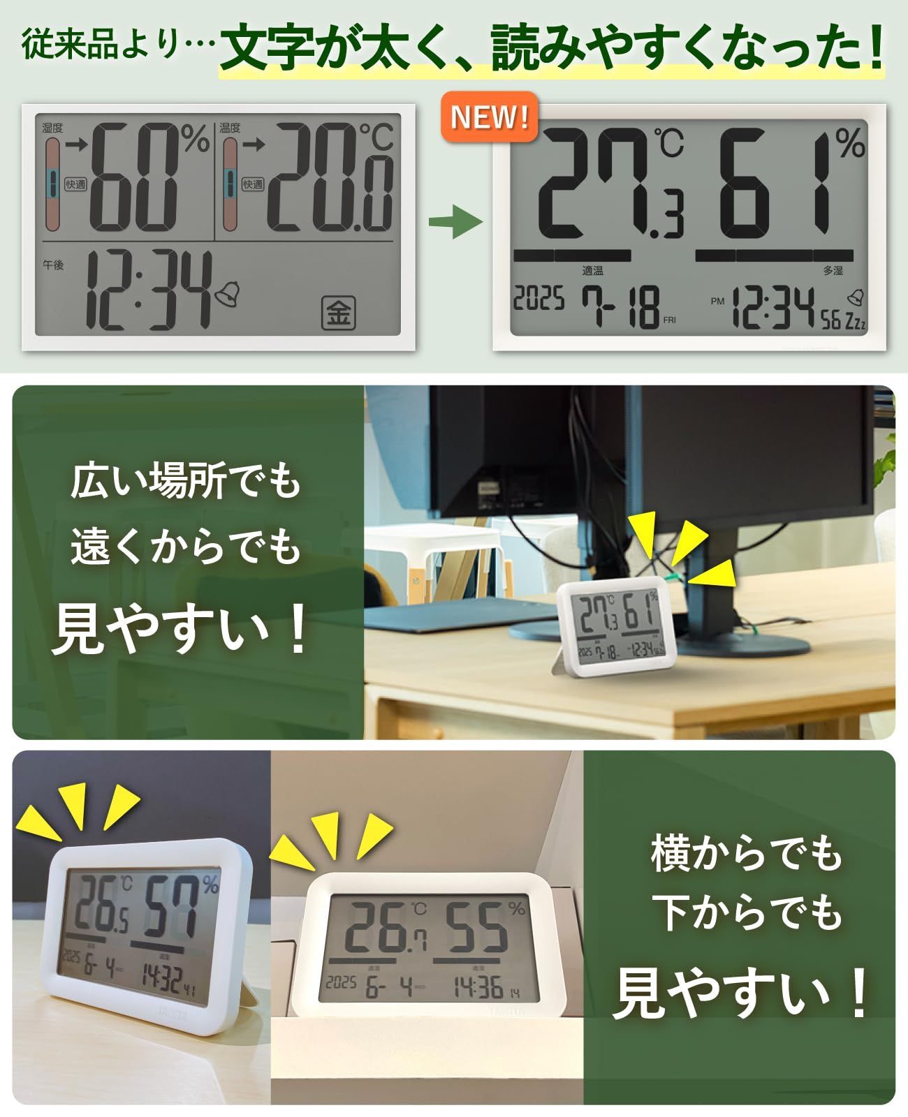 ・大きくて見やすい大型表示・バーで直感的に分かる環境判定・最大・最小温湿度表示・西暦も表示するカレンダー・時計表示・アラーム機能・スヌーズ機能