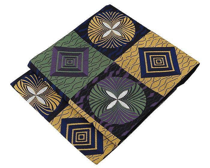 黒地に黄土色や草色・紫などの多色と銀糸で格子幾何模様が柄付けされています。