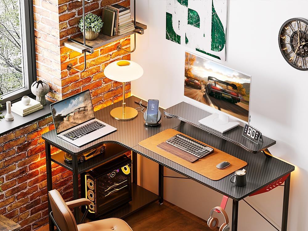 【ゲーム機能満載】E‐スポーツが流行っている現在、クールでカッコいいl字デスクはゲーマーにとっては最高の物です。塗装ではなく剥がれにくいし、カーボン調の天板がグッとゲーミング感を高めてくれます。便利な回転フックと配線孔付きで、ごちゃごちゃした配線、バッグやヘッドフォンなどを綺麗に収納できます。
