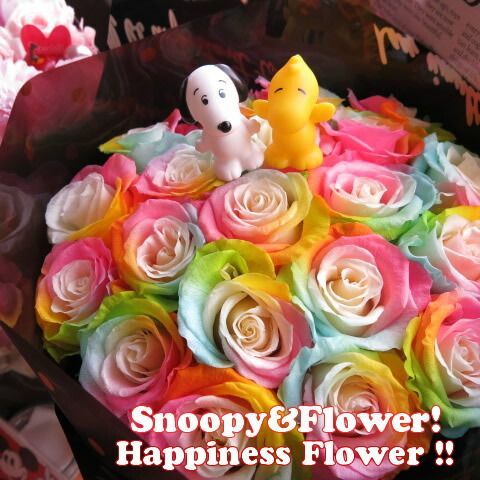 プレゼント スヌーピー入り 花束 レインボーローズ プリザーブドフラワー 20本使用 スヌーピーマスコット種類はおまかせ 何が入るかはお楽しみに