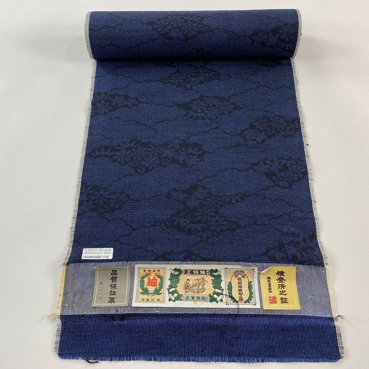 反物 秀品 夏物 紬 証紙 雲文 草花 紺色 正絹