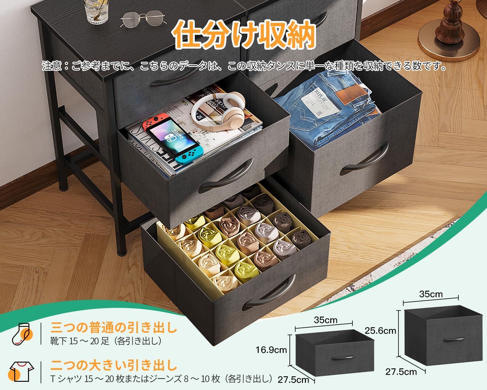 【さまざまな場所で活躍】このチェストは、寝室、クローゼット、リビングルーム、子供部屋、廊下、ベッドサイドに最適です。ランプ、花瓶などの装飾品を木製天板に置くことができます。