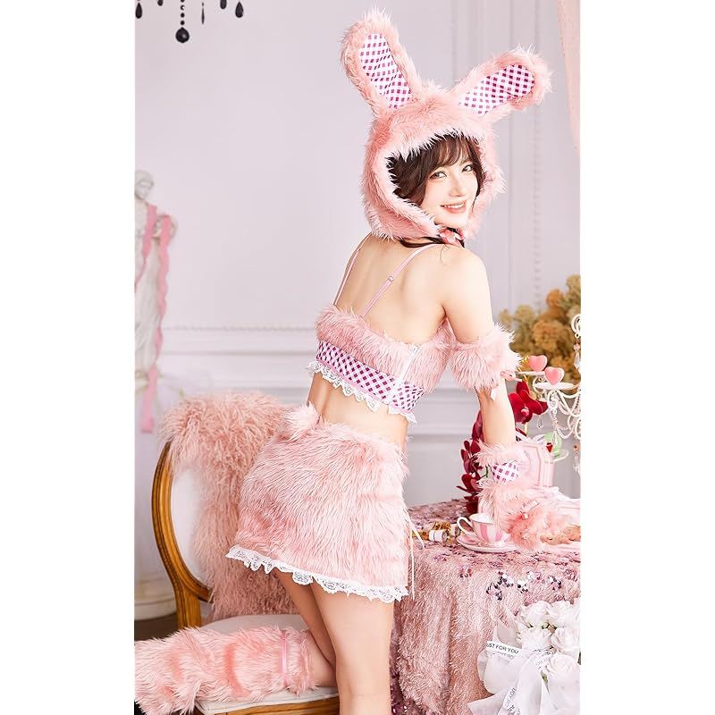 Malymoon コスプレ バニー バニーガール うさ耳 ぬいぐるみ ファー うさぎ ギンガムチェック リボン アイドル 衣装 仮装 マリームーン 8点セット 9960 ピンク 0