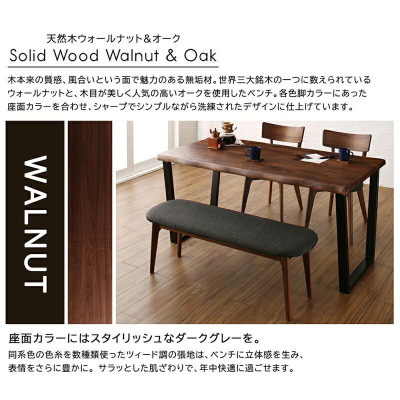 木本来の質感、風合いという面で魅力のある無垢材。世界三大銘木の一つに数えられているウォールナットと、木目が美しく人気の高いオークを使用したベンチ。各色脚カラーにあった座面カラーを合わせ、シャープでシンプルながら洗練されたデザインに仕上げています。