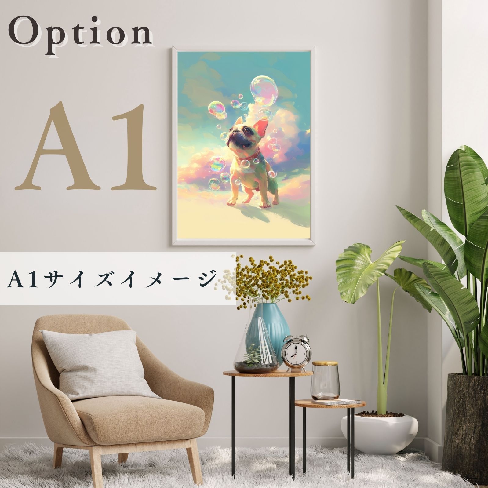 かわいいフレンチブルドッグ犬が、空に舞うシャボン玉を見つめる愛らしい瞬間を切り取ったアートポスターです。