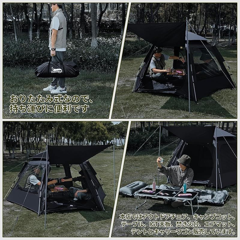 ?【四方向に大きく広い窓を設置し、テントのトップカバーを分離可能で&四季に対応】スペースはとても広々としていて、2人家族が横になったり座ったりするのに非常に快適です。テントのトップカバーを130(S)cmに高くして、圧迫感や蒸し暑さから解放します。◆【五面からの循環通風で、蚊や虫を防ぎ、春夏に適しています】暑い夏により通気性が良く、蒸し暑さを防ぎ、遠くの景色をよりよく眺めることができます。蚊や虫の侵入を防ぎ、キャンプをより安全にします。◆【閉じた窓とトップカバーで、密閉性と保温性が最高に達し、秋冬に適しています】プライバシーを守り、雨水の侵入を防ぎ、秋冬のアウトドアキャンプをより暖かくします。◆テントのトップカバーを分離することで、通気性と快適さが大幅に向上し、雨を防ぐ保温効果もあります。テントのトップカバーを分離することで、通気性と快適さが大幅に向上し、雨を防ぎ、保温効果もより良くなります。◆【アップグレードされたファイバーフレーム】:強靭な耐風フレームで、5~6級の強風に耐えることができます。