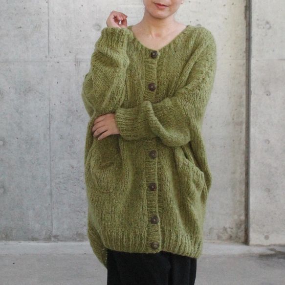 つつむ 手編みモヘアロングカーディガン 若草オリーブ