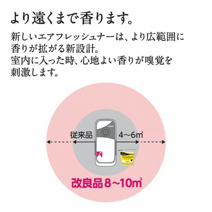 爽快・さわやかな香りで、化粧室以外にもアミューズメント施設やホテル等、多国籍の方が集まる場所におすすめ。より広範囲に香りが拡がる新設計です。室内に入った時、心地よい香りが嗅覚を刺激します。取り換え期間を長くし、メンテナンス性と経済性を向上させました。