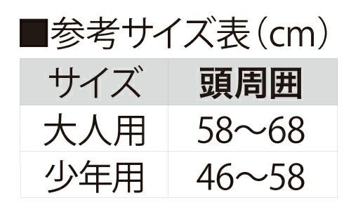 サイズ:大人用(頭周囲58〜68cm)・少年用(頭周囲46〜58cm)