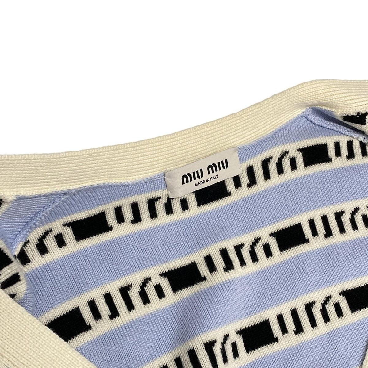 miumiu ミュウミュウ カーディガン サイズ38 S レディース MMF 657 1 V 8 X ライトブルー×アイボリー×黒 長袖 ロゴ柄 ボーダー ウール
