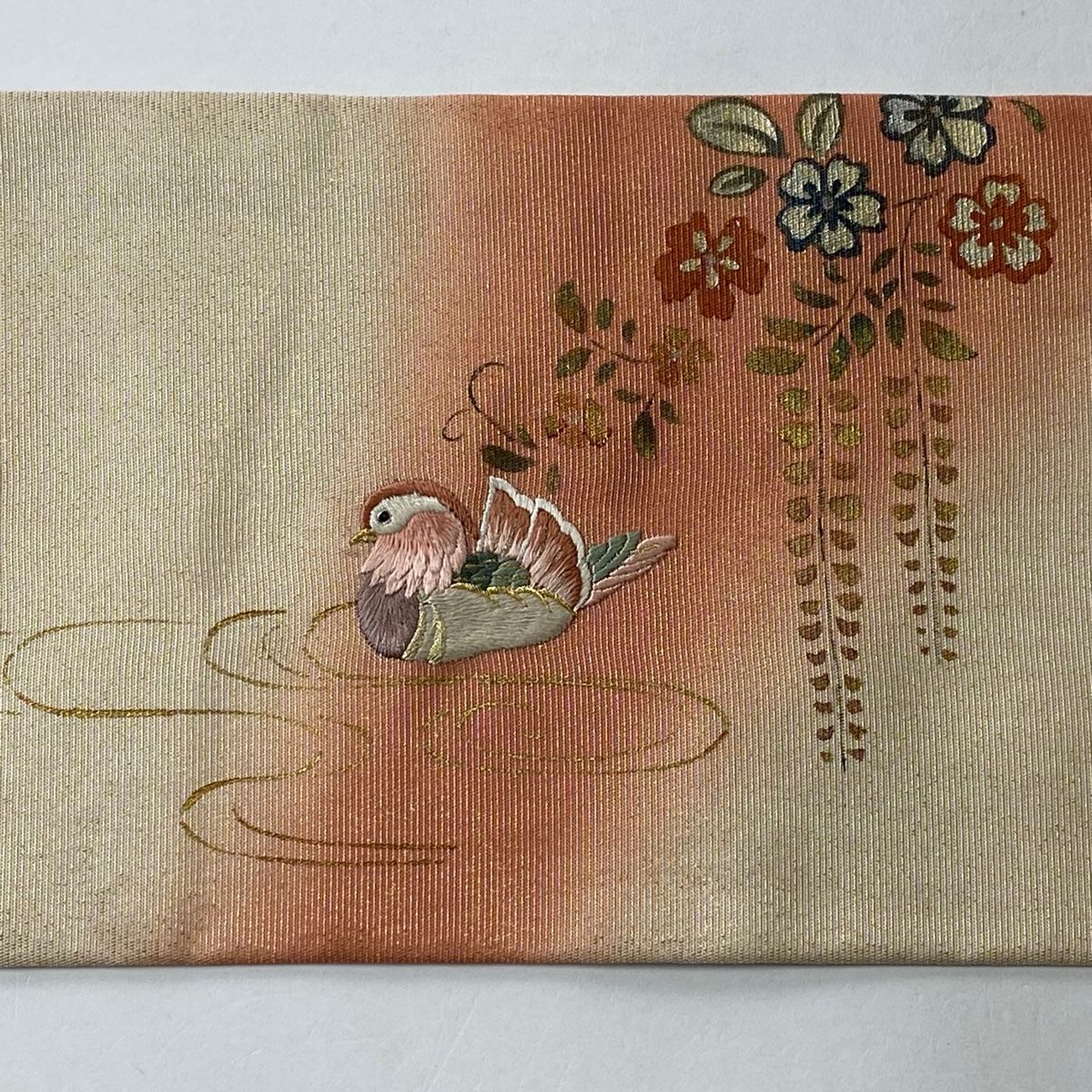 名古屋帯 秀品 鴛鴦 草花 金糸 金彩 ベージュ 正絹