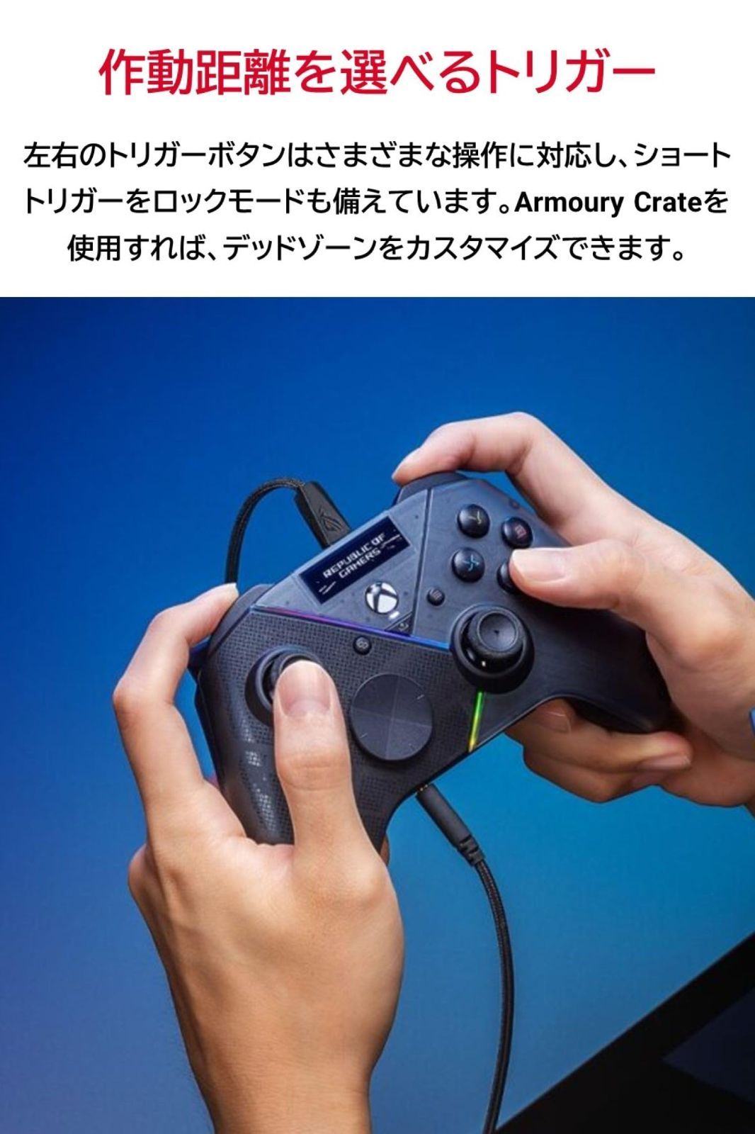 作動距離を選べるトリガー:左右のトリガーボタンはフル、ショートの2段階の作動距離を選択でき、Armoury Crateにてデッドゾーンの設定も可能