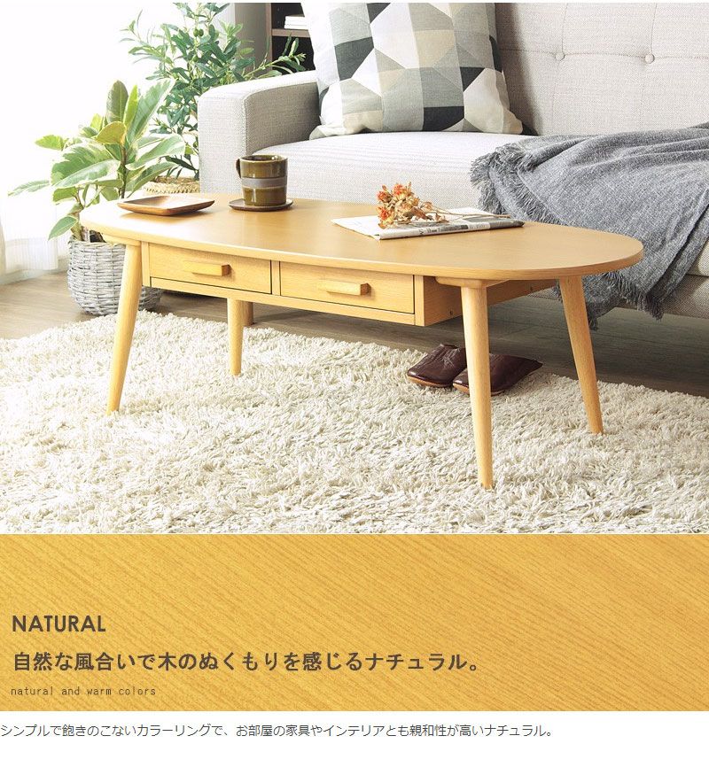 小物を収納できる引き出し付きでお部屋スッキリ♪まあるいカタチが可愛い、木製ローテーブル。丸くて可愛い卵型の楕円形フォルムに、ぬくもりのある木の質感が空間を優しく包み込む、引き出し付きローテーブル・クライス。全体的に丸みを帯びた優しいデザインは、北欧風のナチュラルな雰囲気を演出。安全面も配慮しており、小さなお子様のいらっしゃるご家庭でも安心です。天板下には小物が整理収納できる引き出し付きで、使い勝手も良いデザインに仕上げました。引き出しは前後どちらからでもお使いいただけるので、頻繁に出し入れする物は手前に、普段あまり使わない物は奥に入れるといった使い方もできて便利です。こちらは存在感のある幅110cmタイプで、2〜3人掛けソファとの相性抜群。1人暮らしはもちろん、家族で集まるリビングにもぴったりのサイズ感です。カラーはシックで落ち着きのあるブラウン、温かみを感じるナチュラルに、フェミニンな印象のホワイトを加えた3色展開。お部屋の雰囲気に合わせて選べるカラー展開で、コーディネイトの幅が広がります。サイズ本体:幅110×奥行48×高さ37cm引出内寸(1杯あたり):幅24.5×奥行33.5×深さ5cm素材天板:化粧繊維板、塗装 / 脚部:天然木、塗装仕様カラー:ブラウン/ナチュラル/ホワイト引出は両側から使用可能耐荷重:天板10kg、引出5kgお客様組立品(脚部のみ取付)※除光液などの溶剤は塗装の剥がれの原因となりますので、テーブル周りでのご使用は十分ご注意ください。
