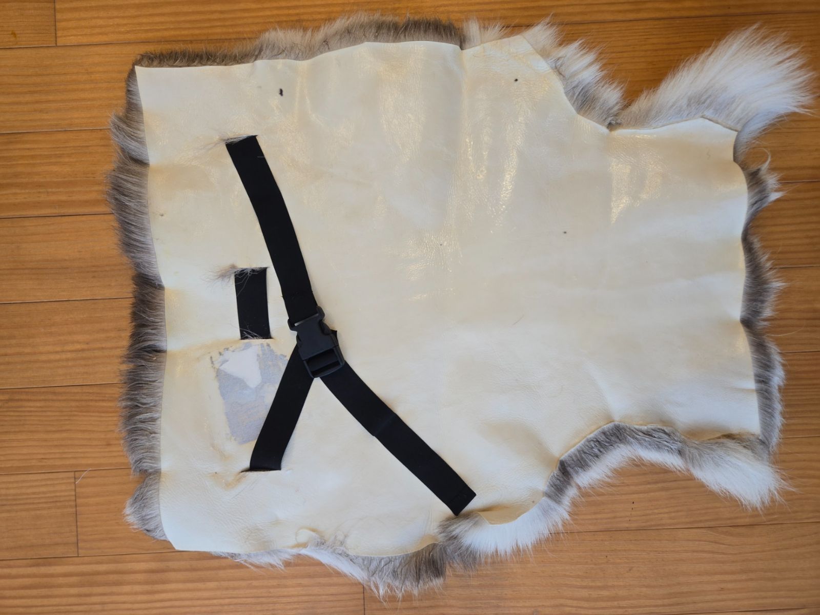 トナカイシートパッドよりも大きいサイズで、上部に調整可能なベルトが付いています。例えば椅子の背もたれに固定すれば、ずれることなく便利です。