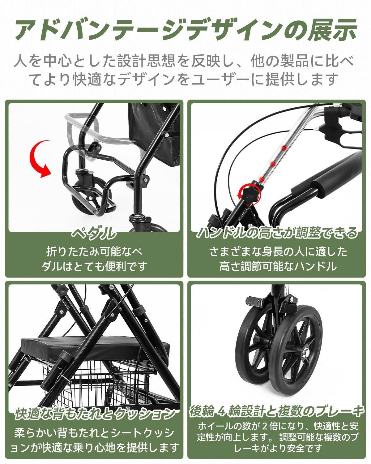 【マルチに調整可能なデザインは、より多くの使用シナリオに適応します】■1■:身長に合わせて4段階のハンドル高さ調整が可能!■2■:背もたれは前後どちらの位置でも取り付け可能で、椅子として使用したり、押して移動したりしやすいです。■3■:ペダルは折りたたむことも、跳ね上げて収納することもできます。