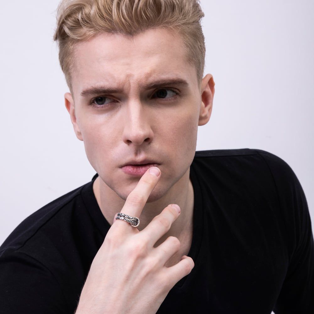 Two slim bands are carved with flowing angel-and-devil wing lines and joined by a polished connector ring that moves lightly across the finger. A small shift in position changes the silhouette—from layered drama to a clean, minimal line. One band holds a white cubic zirconia, the other a black stone; the monochrome contrast adds a refined edge. Delicate relief work traces every feathered curve, and the sterling silver’s luster catches the light with quiet elegance. Thread a chain through the connector ring and it transforms into a charm pendant—one piece, two distinctive looks. Each ring is cast and hand-finished in our atelier for a smooth, comfortable fit and beautifully crisp details. Modern playfulness meets meticulous craft in a design made to be worn often and loved long.